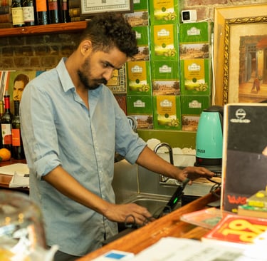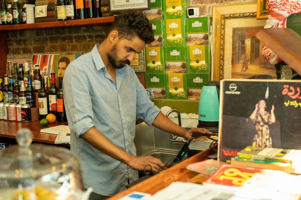 El Atigh Abba, owner of Barzakh Cafe at the counter.