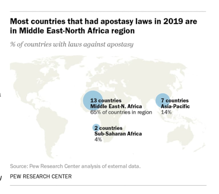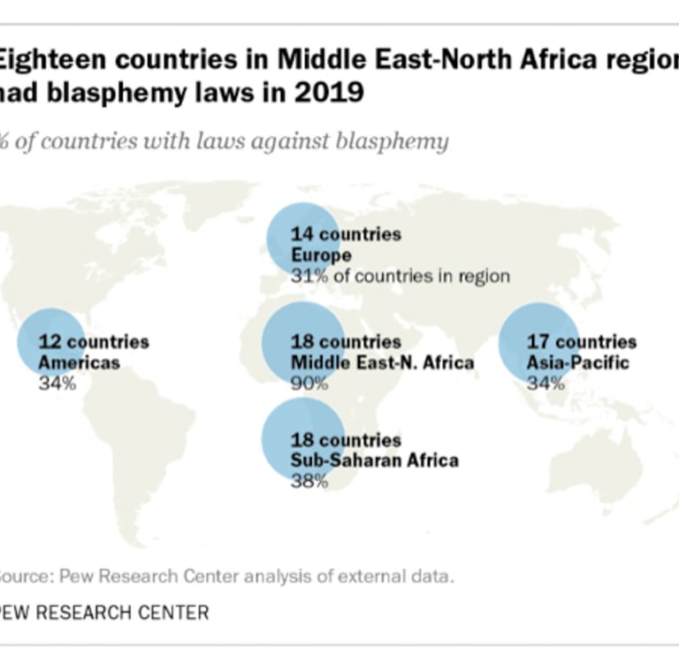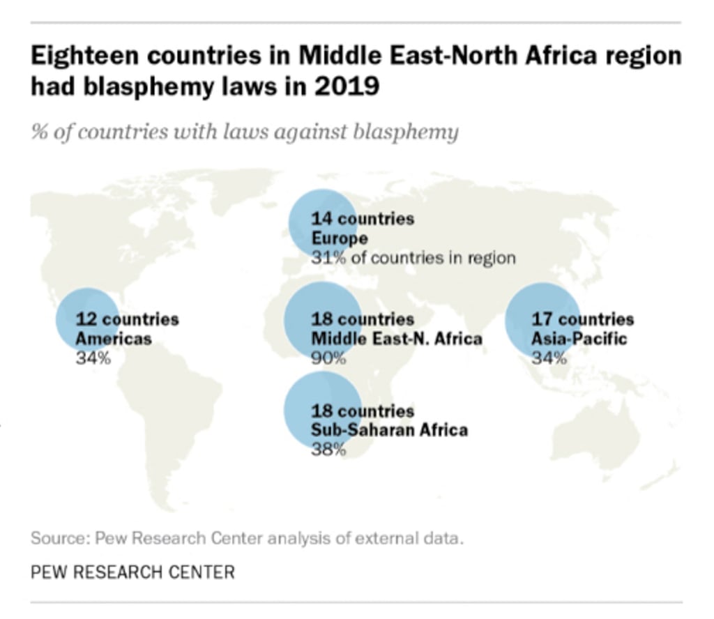 According a recent study by Pew Research Center based on information last collected in 2019, 40 percent of countries around the world have blasphemy laws, which are usually broad encompassing laws, that lack clear definition. These laws are usually used against people who speak out, criticizing the social and political status quo. It is a tool to silence dissent. This research showed that most blasphemy laws are in Muslim-majority countries. It found that the region with the highest concentration of these laws was the Middle East and North Africa, which scored 90 percent.